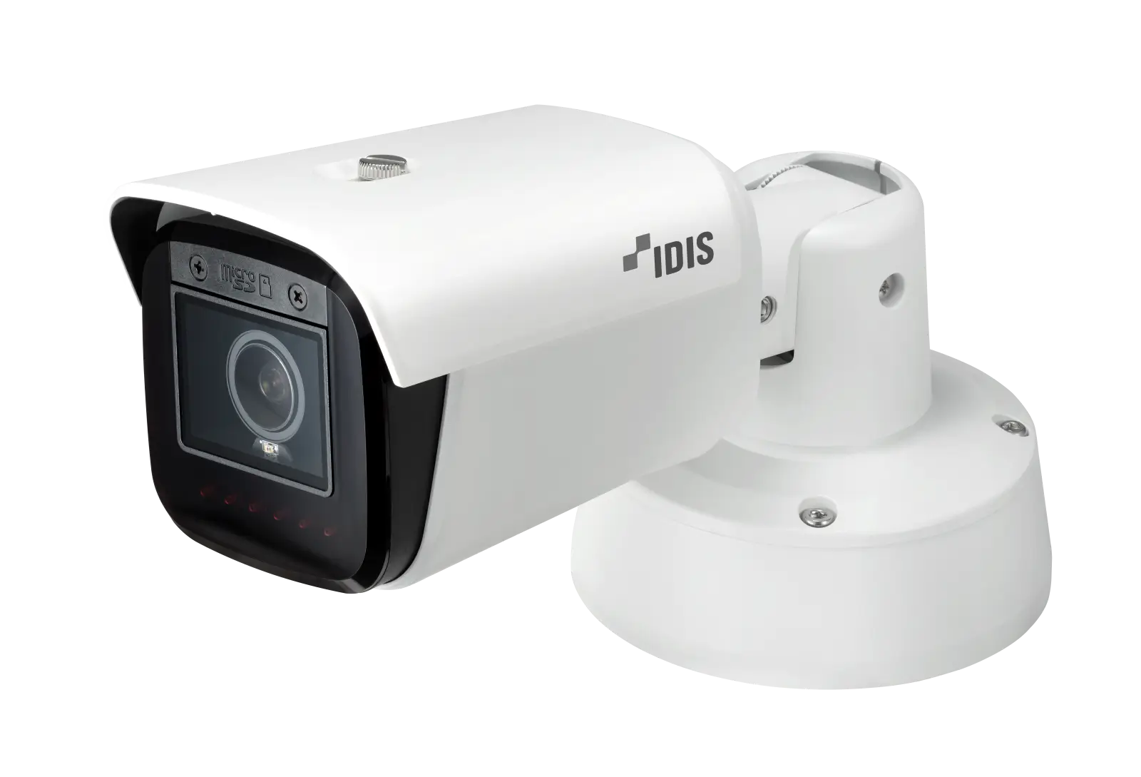 Long-range outdoor surveillance for perimeters, car parks, and building facades. IDIS bullet cameras combine high-resolution sensors with powerful IR LED arrays — the DC-T6831WRA Edge AI Plus variant delivers 8MP detection with on-camera AI analytics and IR to 60m.